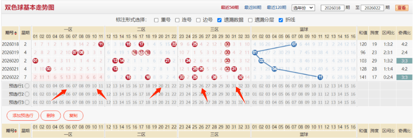上期双色球的开奖号码为:15 18 23 25 28 32+11,和值为141,跨度为17,区间比例为0:2:4,奇偶比例为3:3012路比例为2:2:2,上期双色球开出的最大难度特征趋势主要在于一区号码断区,在断区的调整节奏下,本期需要关注将断区回补的可能性还是非常大的,本期不考虑一区继续断区,反倒是上期的三区热度极大概率会下降,这是本期号码的初始基本思路。