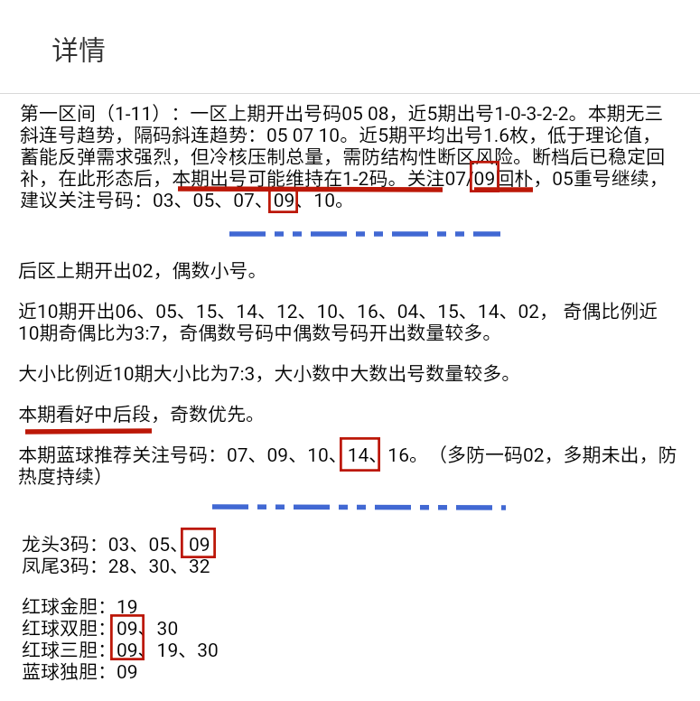 会员文章中一区维持2码,关注09回补,龙头开出09。后区看好中后段。