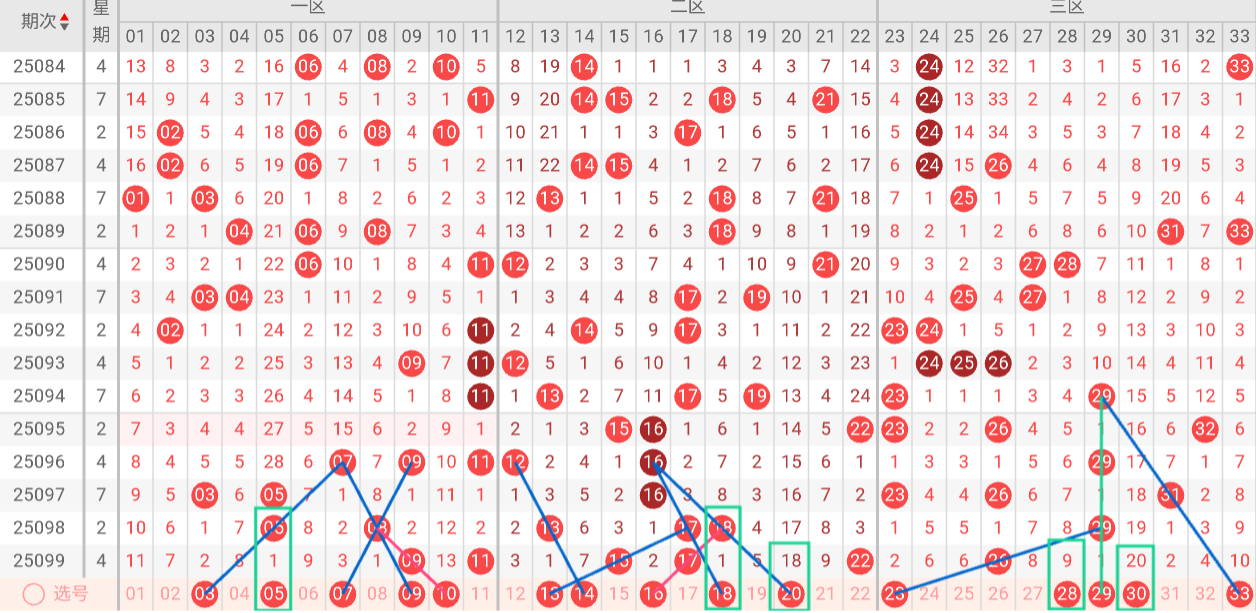 根据以上特点,我们对双色球第25100期进行如下分析: