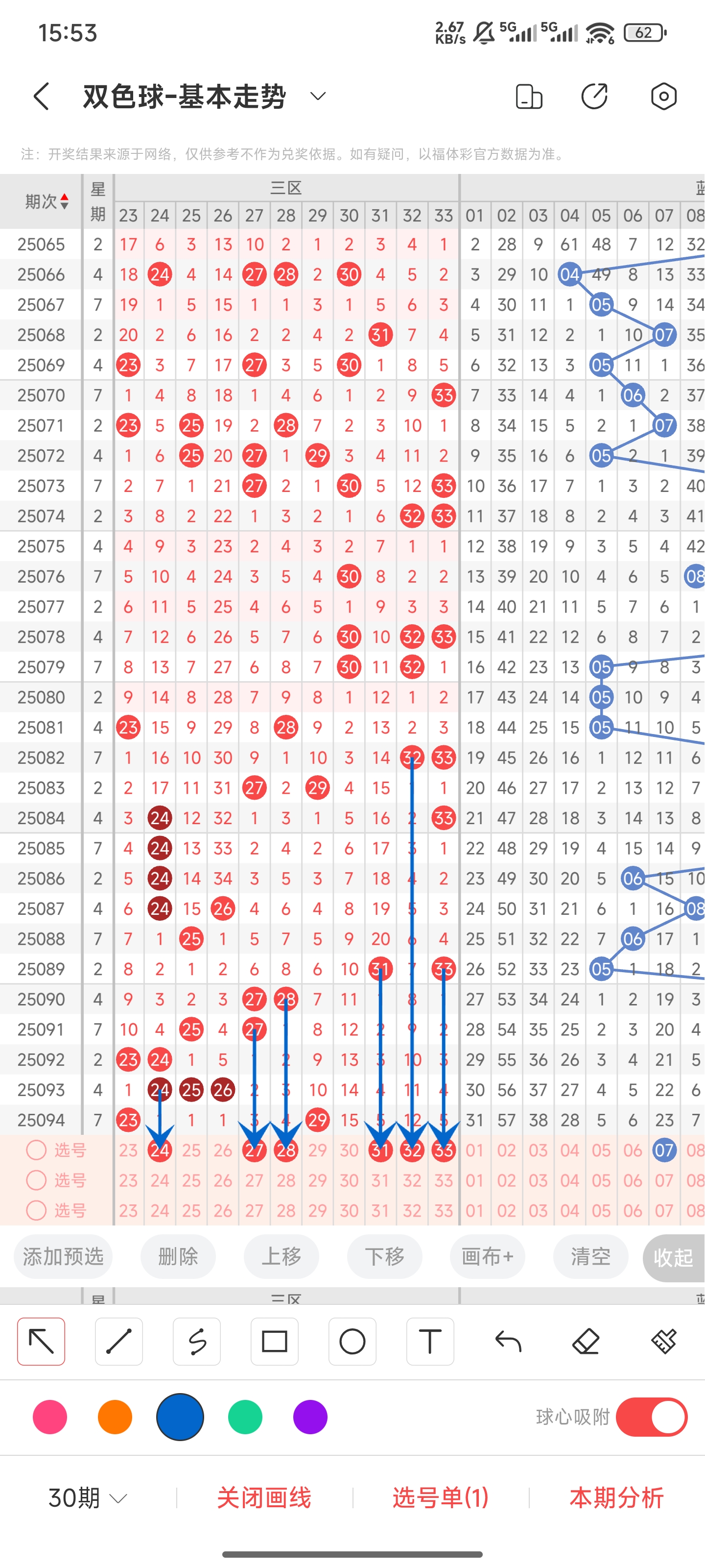 上一期三区开出2329。往前一期开出的是2425262329号是温号和冷号,所以本期我们就不考虑连出。通过分析走势图,最近几期开出的号码比较集中在左半边,所以推测本期有可能右边的号码会回归,所以我们可以关注313233。但左边和中间的号码也有可能开出,结合遗漏期数和冷热号,我们可以关注242728。综上所述本期我们推测有可能开出242728313233等号码。