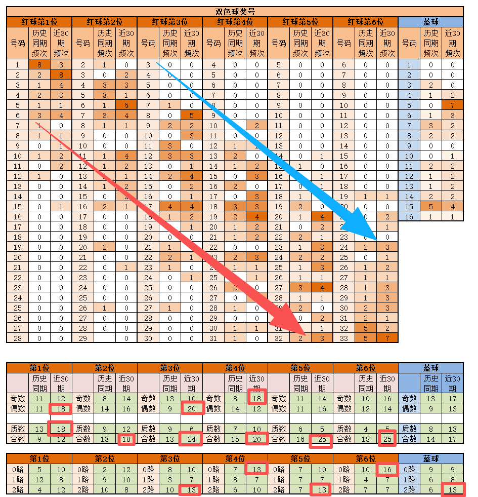 蓝球,历史同期频次最多的为15;近30期,频次最多的为5,明显特征是2路优势;推荐重点5-6-15。