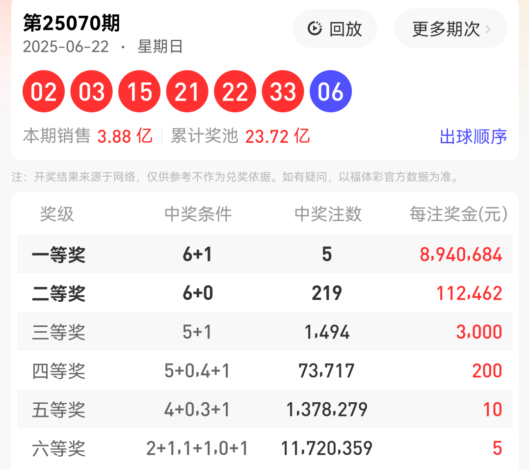 上期回顾:福彩双色球红球开出020315212233,蓝球开出06