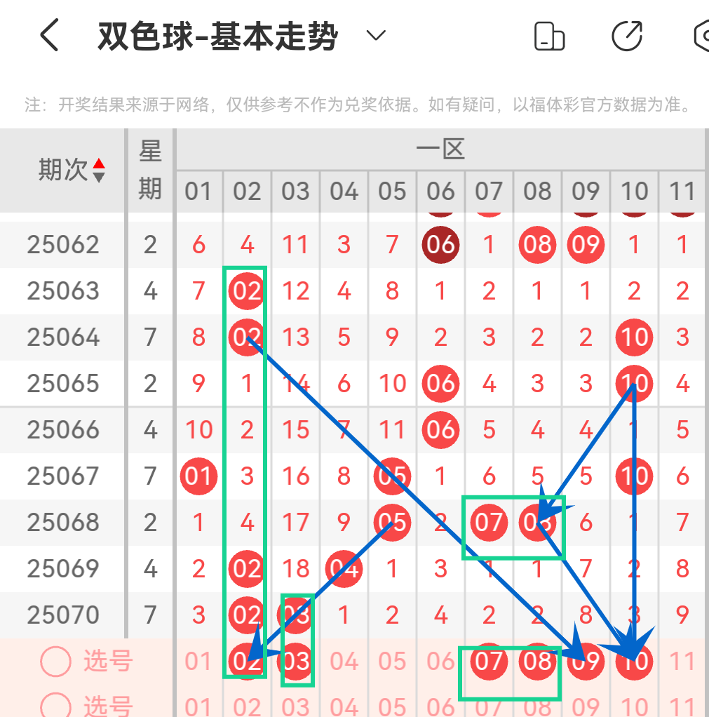 上期一区开奖号码出2个,近100期开奖中,一区号码表现较热,本期预计一区号码会继续开出,持续稳定;根据历史走势图可得,上期出现02码,03码时,下期出现02码,03码,07码,概率为70.3%,根据同时期走势图可得下期出现08码,09码,10码概率为70.2%;本期一区关注号码020307080910