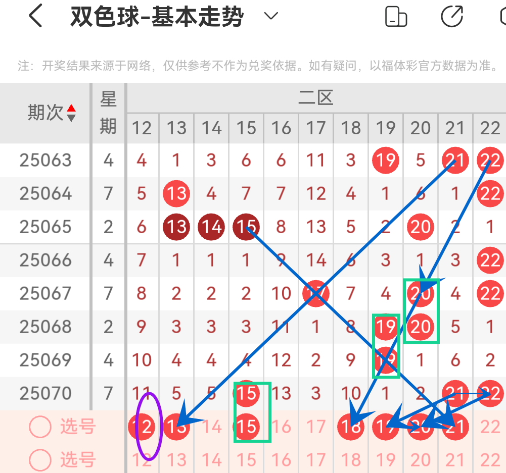 上期二区开奖号码开出3个,近100期开奖中,二区号码比较活跃,属于大热号,证明二区一直属于大优势,根据历史走势图可得,上期出现15码,21码,22码时,下期出现12码,13码,15码概率为70.3%,根据同时期走势图可得下期出现18码,19码,20码,21码概率为70.2%;本期二区关注号码12131518192021