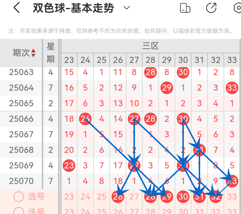 上期三区开奖号码开出1个,近100期开奖中,三区号码表现较热,本期预计三区号码会继续开出,根据历史走势图可得,上期出现33码时,下期出现26码,28码,29码概率为70.2%,根据同时期走势图可得下期出现30码,31码,32码概率为70.2%;本期三区关注号码262829303132