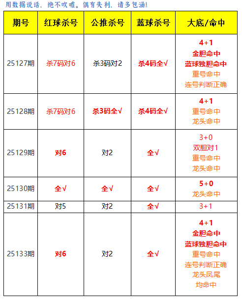上期红球杀7码对6,免费文章杀3码对2,蓝球杀4码全对。