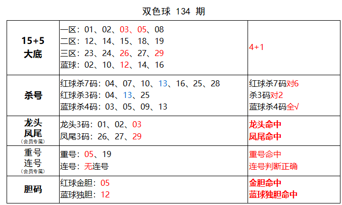 会员文章中金胆命中,蓝球独胆命中,龙头凤尾均命中,重号判断正确,连号命中。
