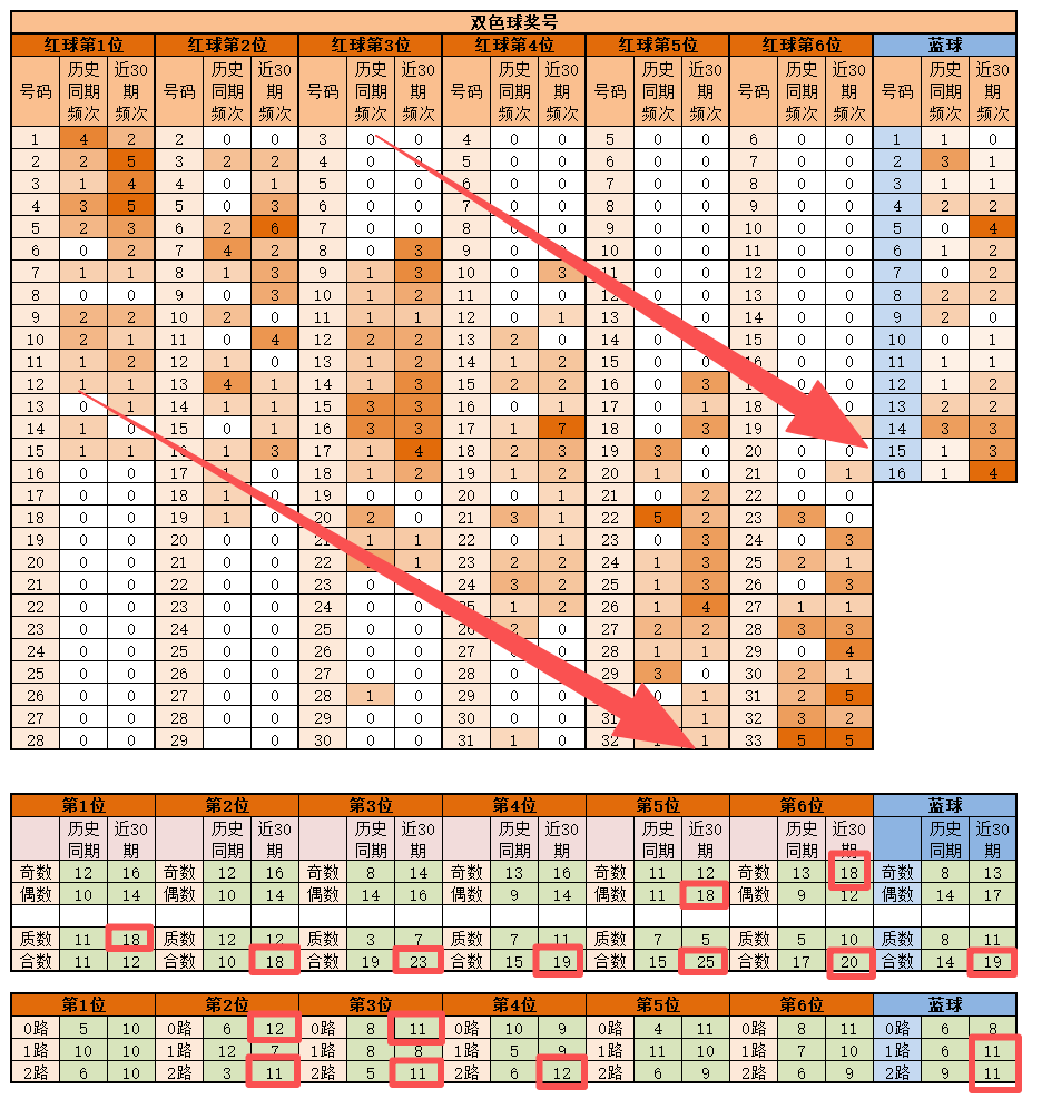 蓝球,历史同期频次最多的为2-14;近30期,频次最多的为5-16,明显特征是合数12路优势;推荐重点5-14-15-16。