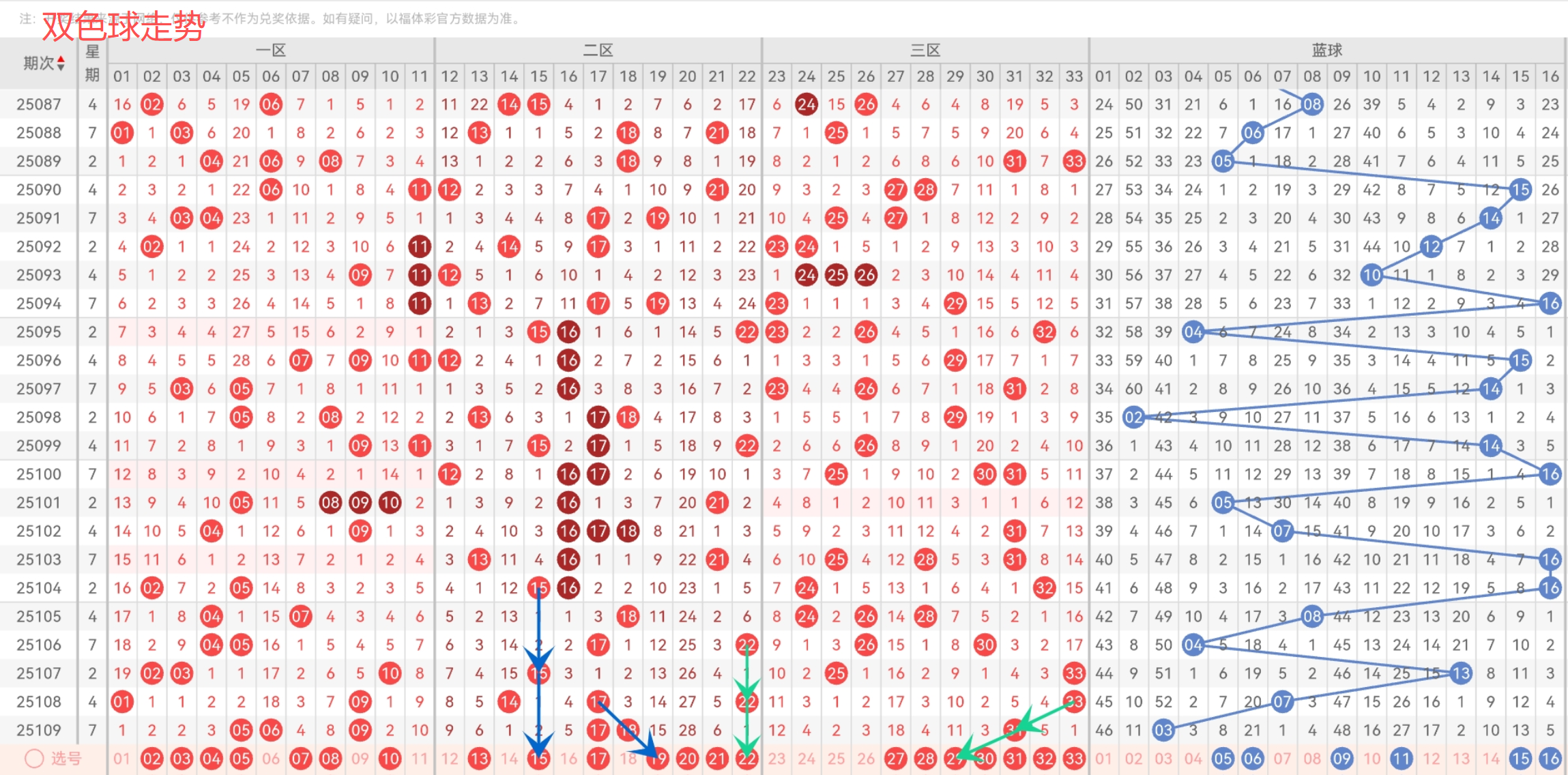 第6位,基本在21-33之间,历史同期频次最多的为33;近30期,频次最多的为31-33,明显特征是合数优势;推荐重点24-26-28-29-31-32-33。