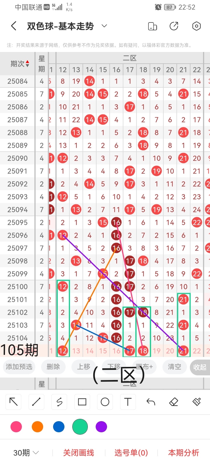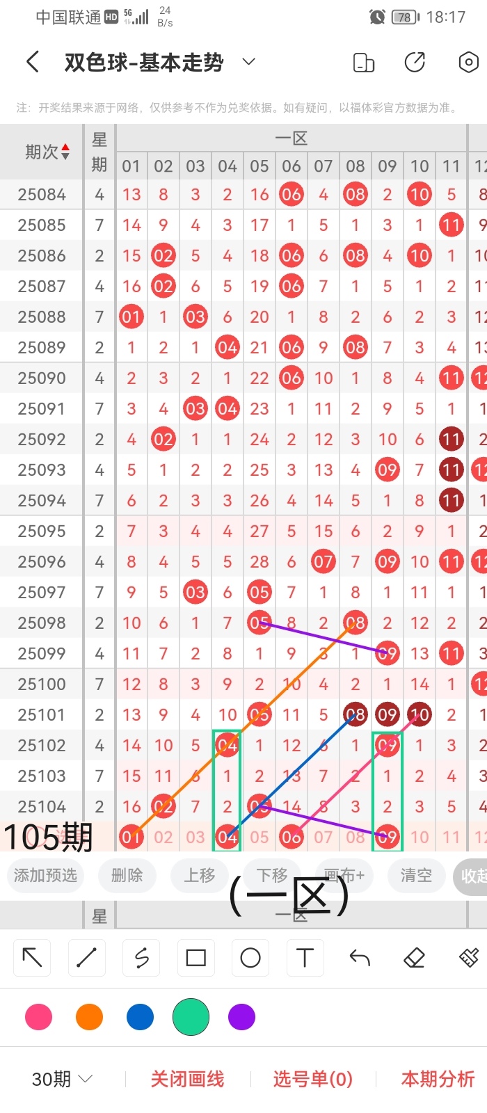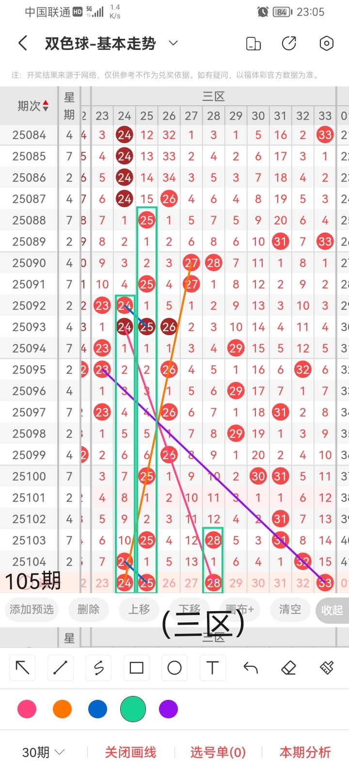 通过以上对上期的简单回顾,下面进入双色球第2025105期(下面简称本期)的选号分析: