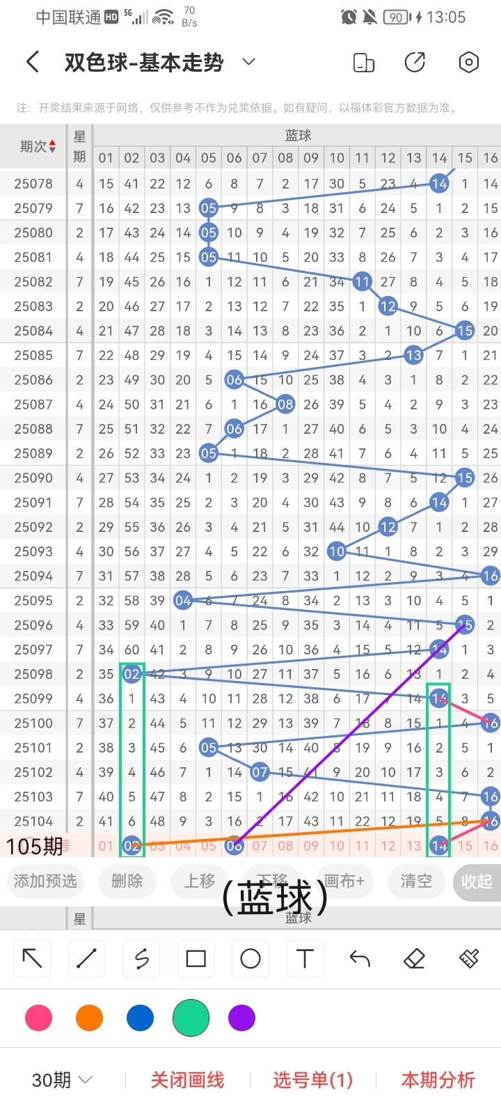 小梁根据图中画线思路,最后给大家汇总提供一下本期红球、蓝球数据,供大家参考: