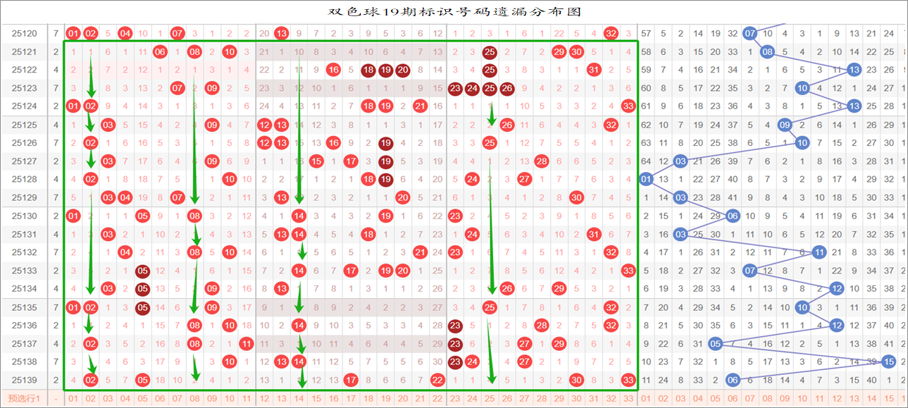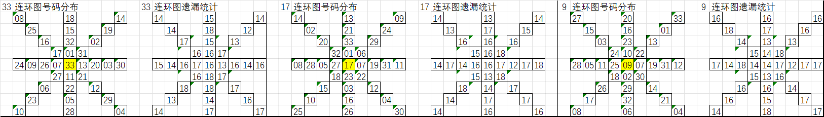 由于数据量大,不一一统计,下图为各个号码分别在33、17、9连环图上的遗漏统计汇总图: