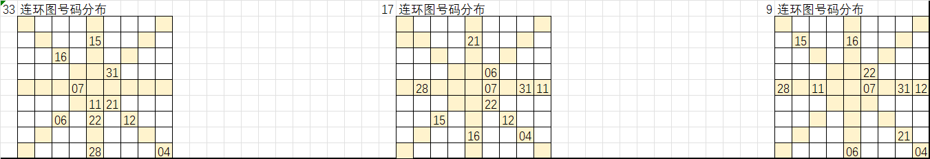 以上是遗漏大于16的号码分别在33、17、9连环图的分布,按照九转连环图选号规律,选取这些号码“环上”和“轴上”的相邻号码作为胆码,把这些胆码进行次数统计即可形成我们组号的排序,从出次多到少进行取号得出我们的大底。