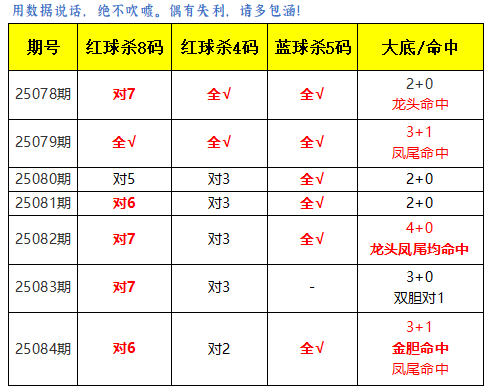 上期红球杀8码对7,免费文章杀4码全对,大底命中2+0,本期再接再厉!