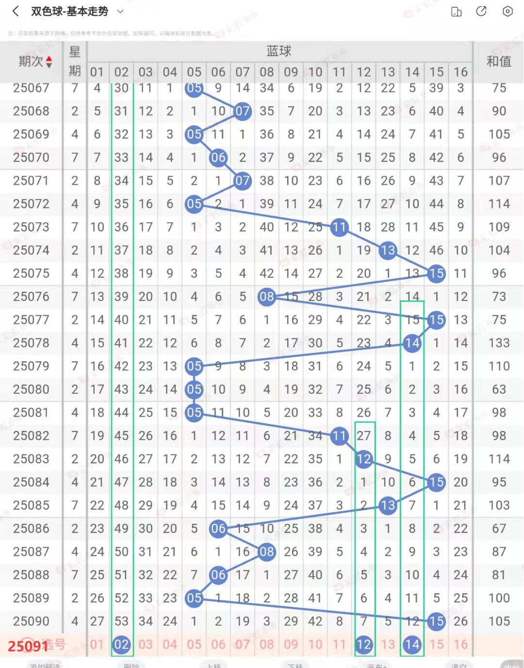 上期蓝球15,偶数、合数、012路为0路,重开机率不大,不过各人的看法而落号,按照奇偶排列走势和质合排列走势本期综合看好偶合数防偶质数,012路看好2路防0路。如小号可参考02,如大号可参考12、14。本期推蓝球号码可参考02、12、14。
