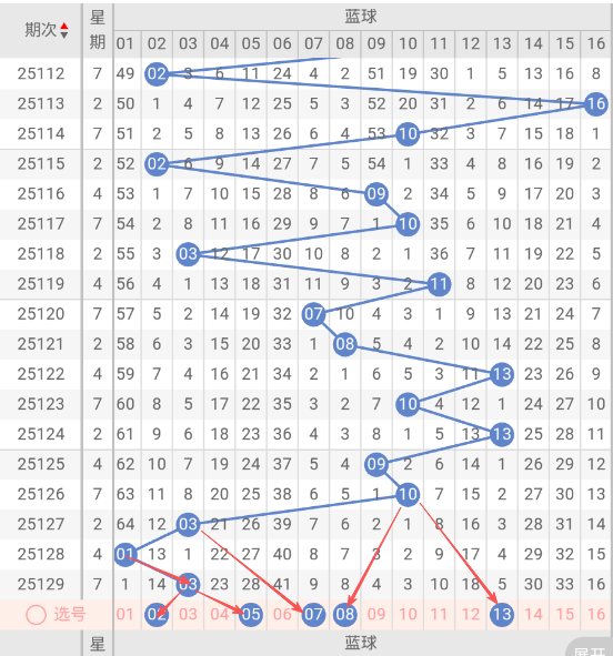 根据走势图近10期的走势看,蓝球在107期开出13蓝球之后,3小1大1小2大1小2大1小1大2小5大3小,再看下近10期的蓝球热码有回补的趋势,这种趋势规律本期判断极有可能开出小号,本期防蓝球13大号,蓝球本期重点关注02,05,07,08,13