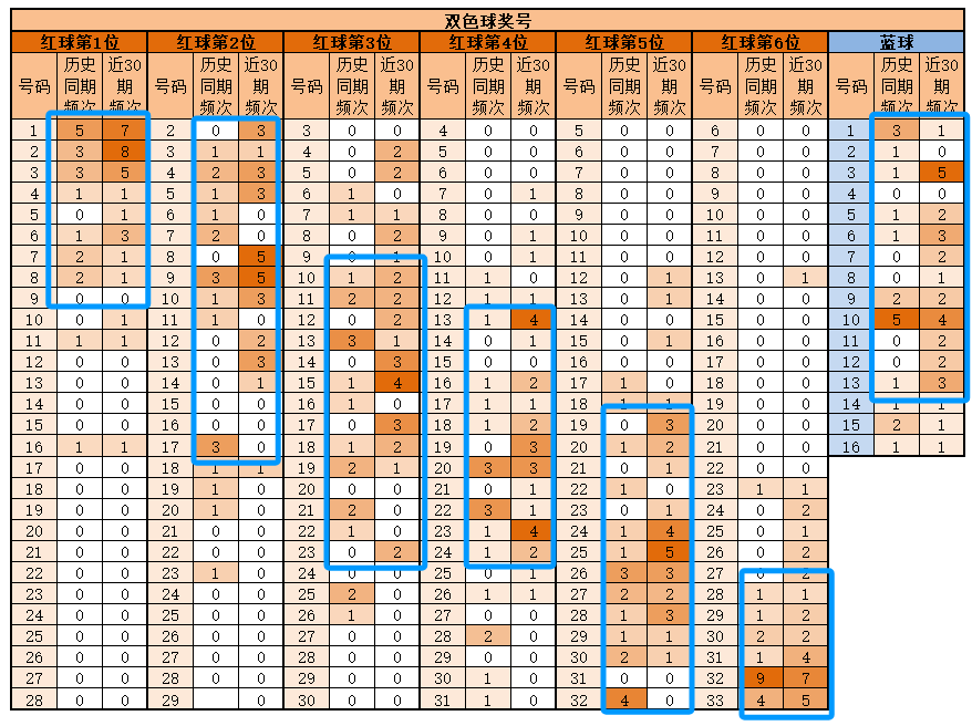 蓝球,历史同期频次最多的为10;近30期,频次最多的为3,明显特征是奇数优势;推荐重点1-3-5-6-9-10-11-12-13。
