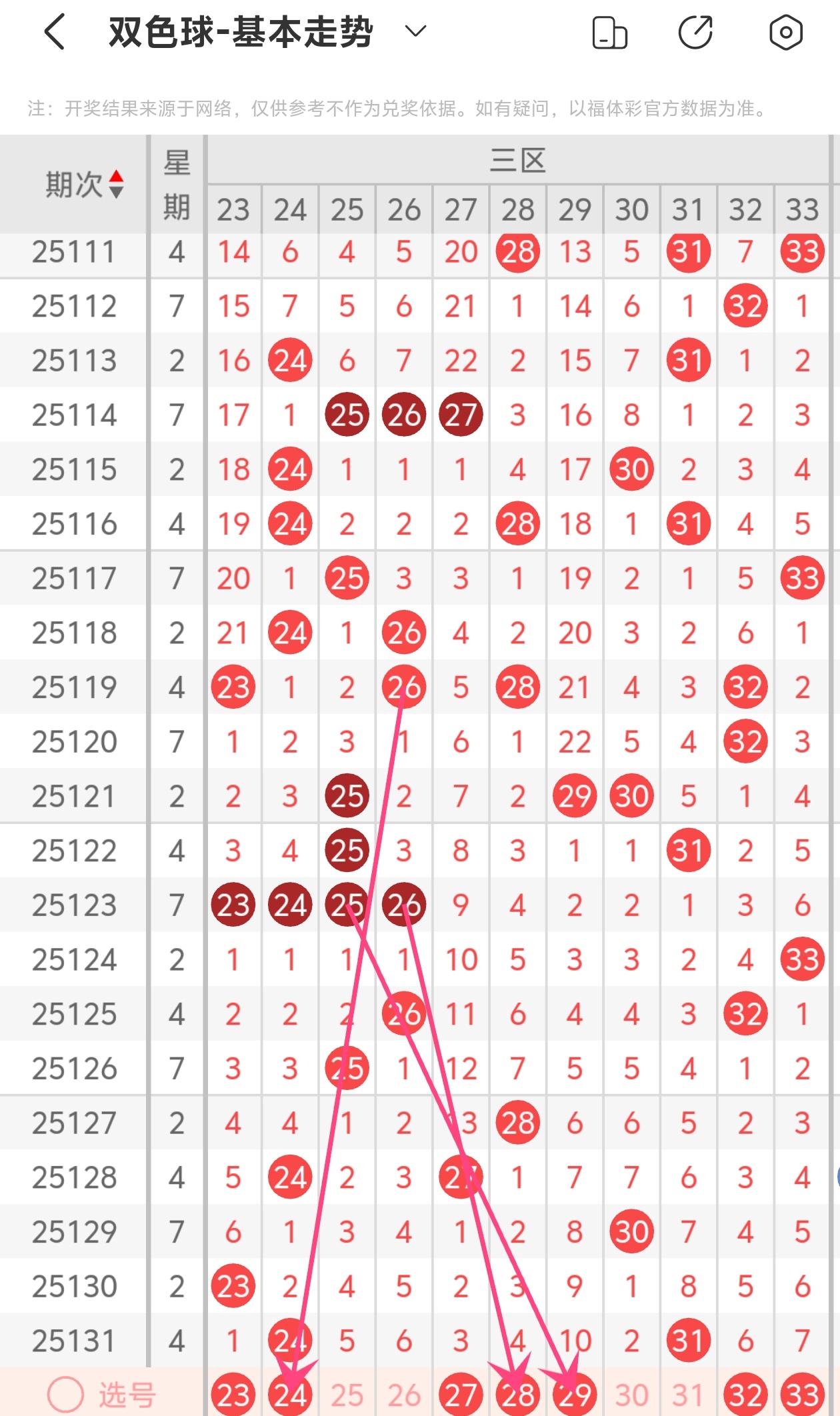 上期第三区间开出24 31,本期我们可以从上面走势图中看到选号的思路,24为斜连走势,28为斜连走势,29为斜连走势,综合以上分析本期第三区间推荐23 24 27 28 29 32 33