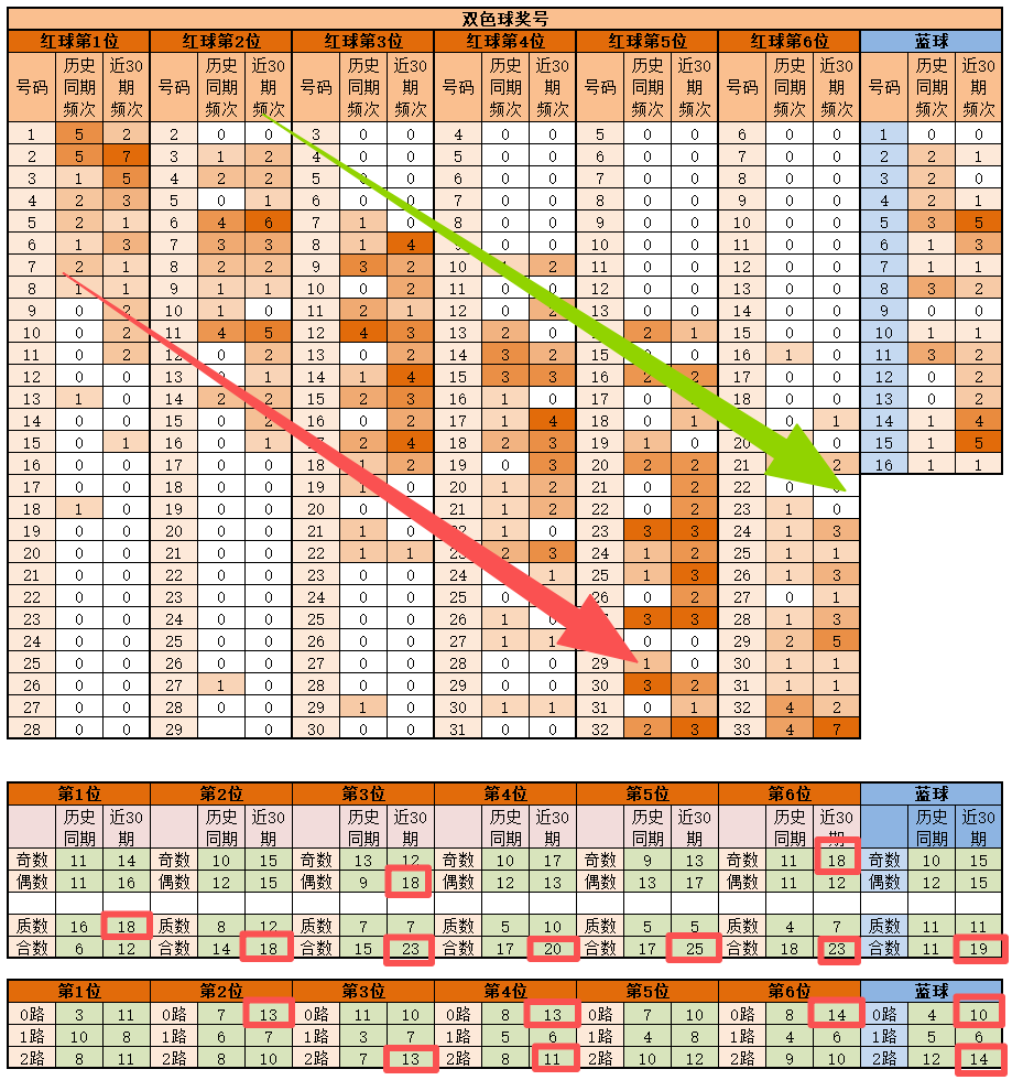 第5位,基本在20-29之间,历史同期频次最多的为23-27-30;近30期,频次最多的为23-25-27-32,明显特征是合数优势;推荐重点23、25、27、32。