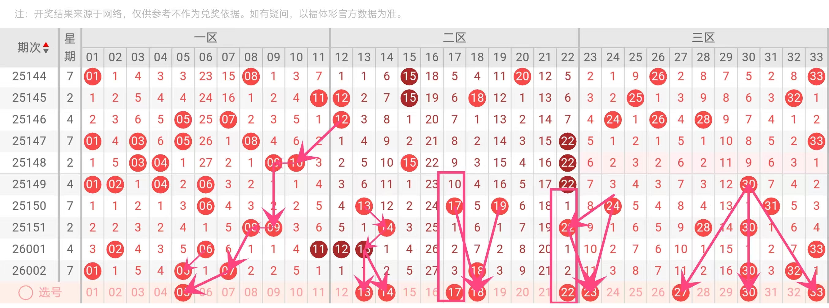 温号回补:17、22、23 在近5期各有1-2次出现,走势平稳且处于中后区活跃带,近期可能再次开出。