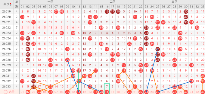 出号轨迹呈现高热后降温企稳的特征。从3码骤降至连续两期1码的低谷,近两期回升至2码,进入温和修复通道。本期大概率维持2码或温和增至3码。建议关注号码:23、25、28、30、33。