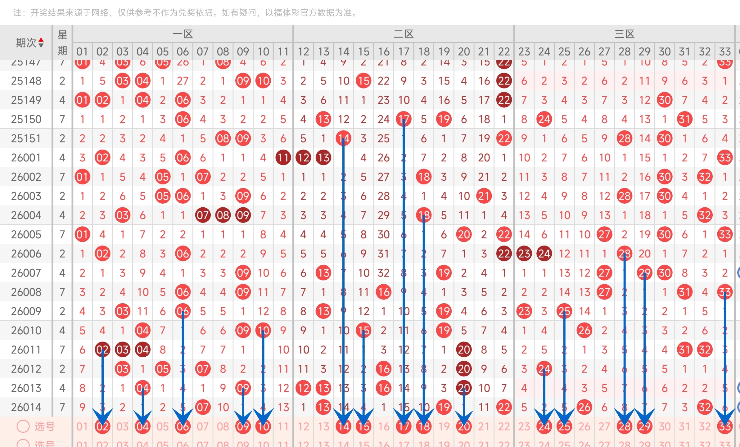 上一期三区开出了26,32号球。往前一期没有开出号码。通过走势图分析,可以看到上期号码开了一左一右,结合最近三区号码走势,左右两边号码开的比较多,本期继续关注,其次是防中间号码回补。最后再结合冷热号和遗漏期数,本期我们可以关注24,25,28,29,33等号。综上所述本期我们推测有可能开出24,25,28,29,33等号码。