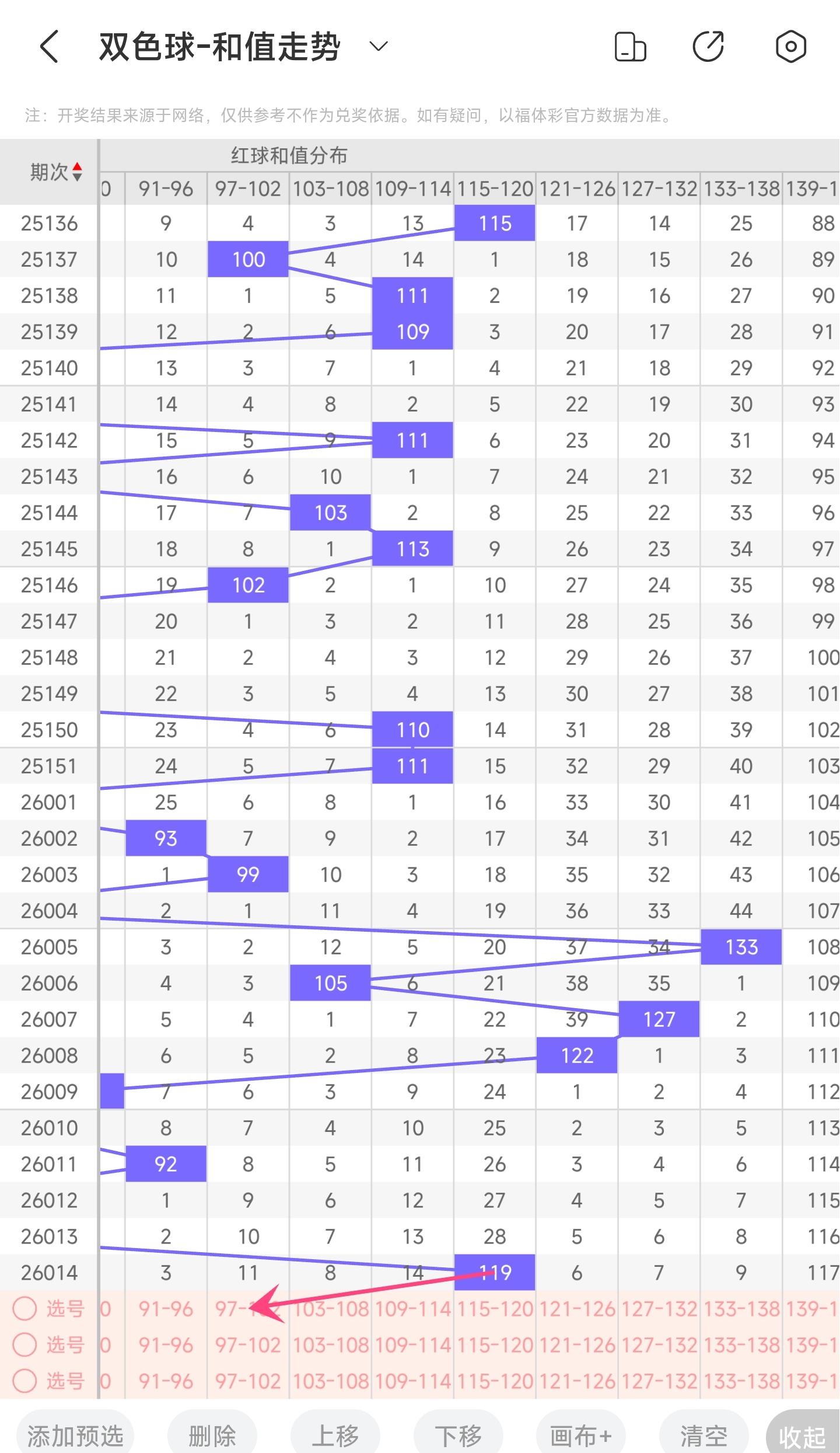 上期和值为119,而近5期和值为83,92,75,74,119,上期和值较前一期增加了36,振幅为36。119和值是属于近30期内开出的很大的和值,上升的空间比较小,下降的空间比较大。本期看好和值变小,所以推测本期和值趋势是大概率往左,和值变小,小概率往右,和值变大。