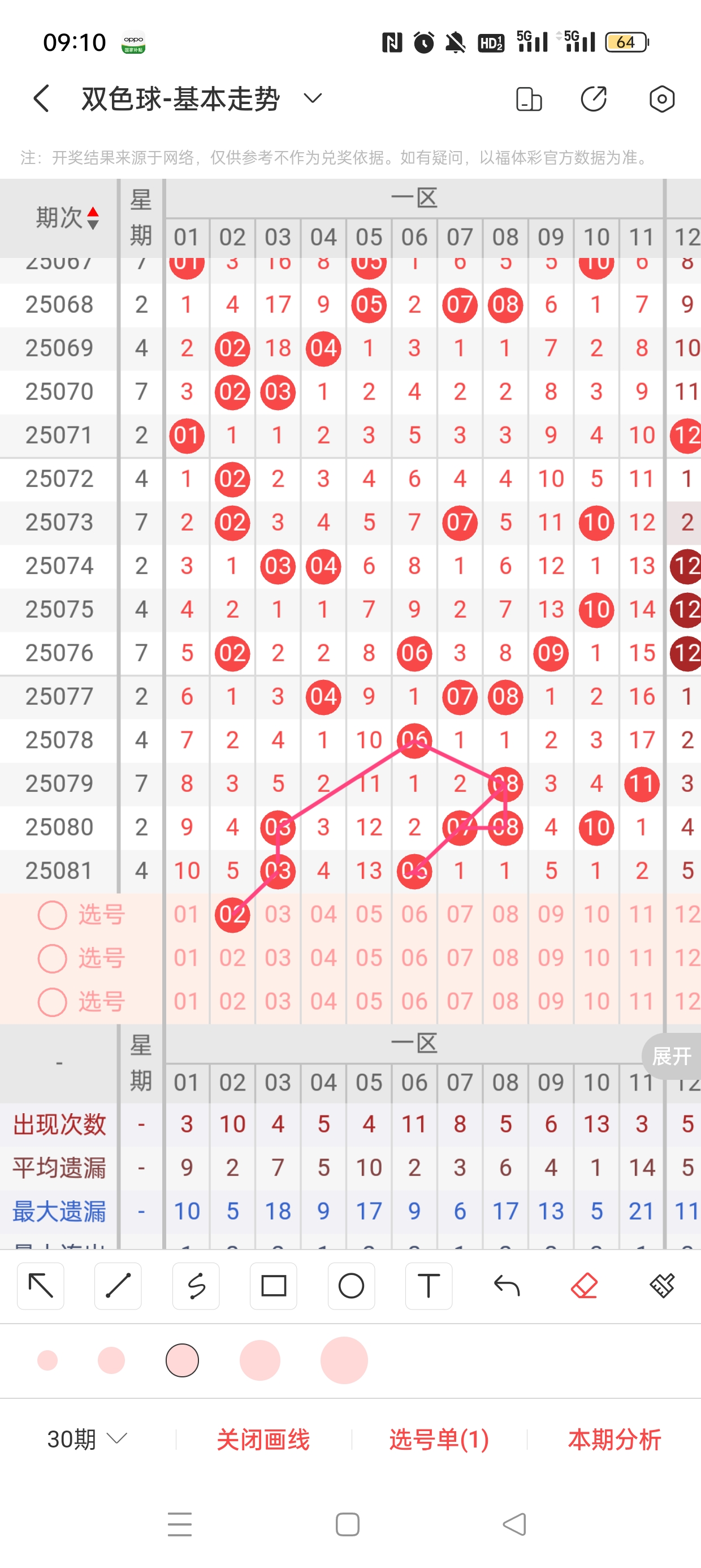 后区(1-16)近79期本区012路14:24:43,1/2路热度高,本期着重0路。10已遗漏33期,与5之间呈现向右遗漏递减态势,需防。