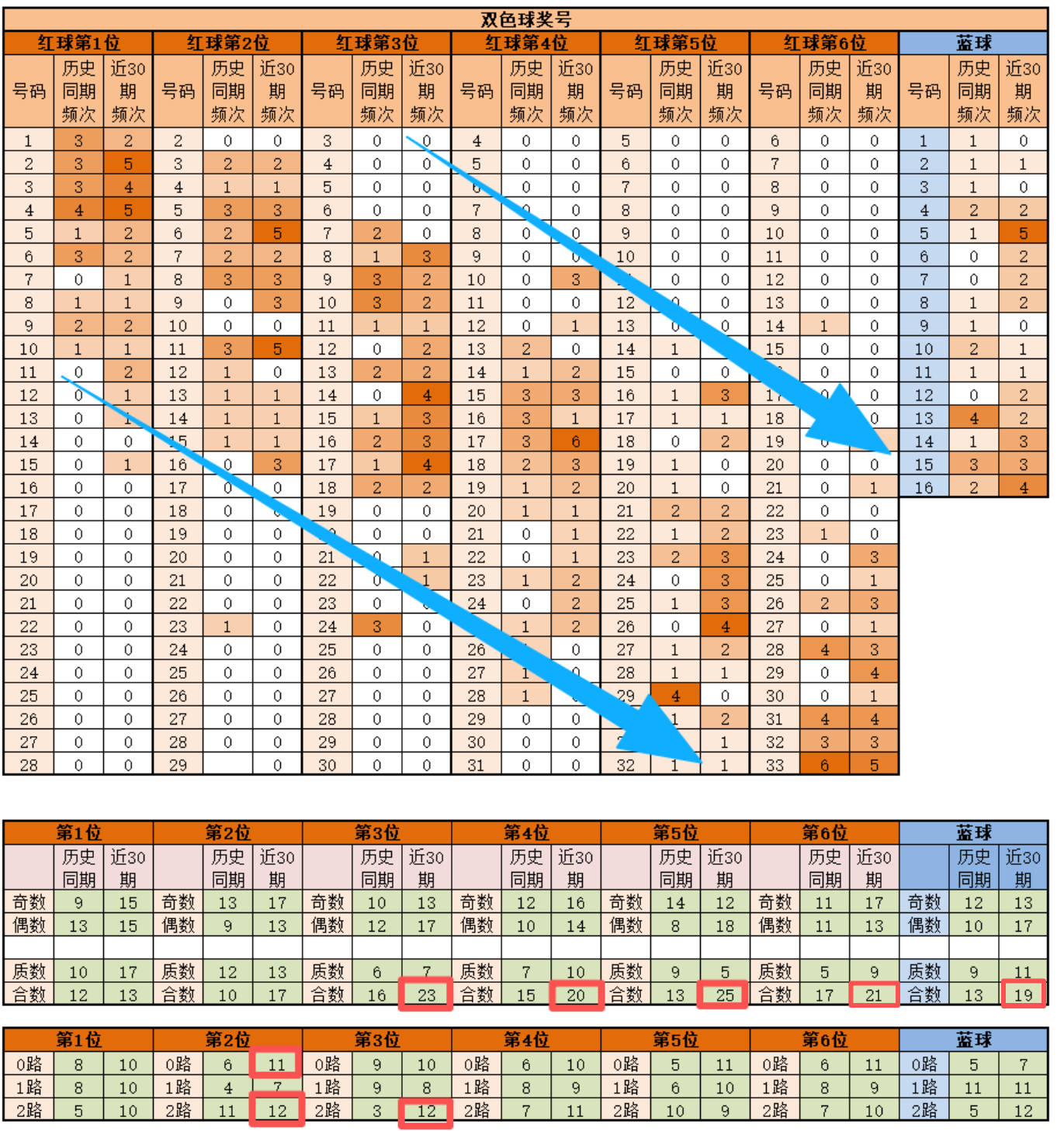 蓝球,历史同期频次最多的为13;近30期频次最多的为5明显特征是合数偶数12路优势;推荐重点5-14-15-16。