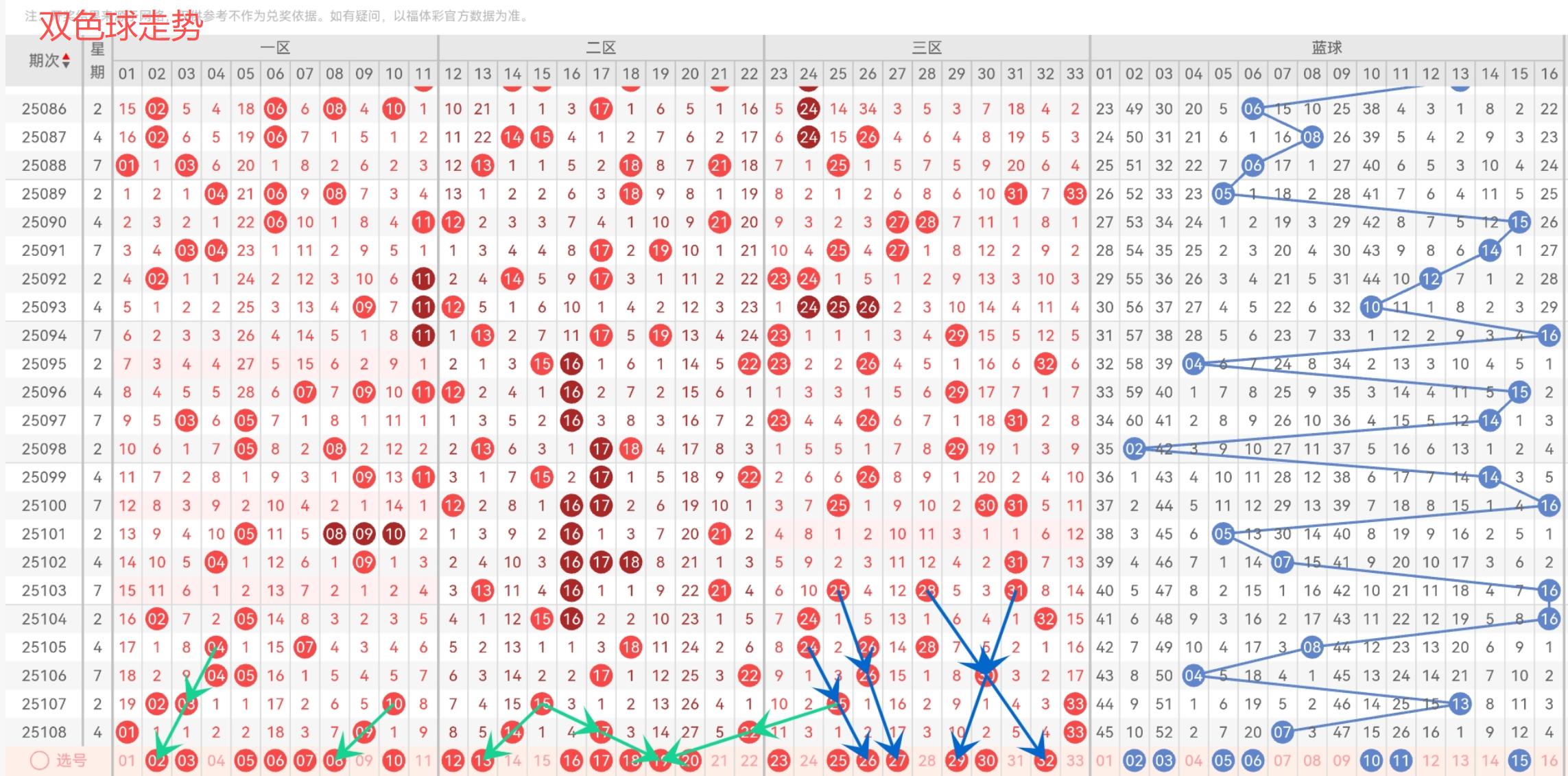 红球三区,上期仅仅出了一码,有点势头下降的趋势,并且最近两期走的也是边路趋势,另外,最近两期,奇数优势比较大,本期可以多考虑防守奇数;从走势看,号码26-27-29-32就不错,可以考虑防守1-2码;