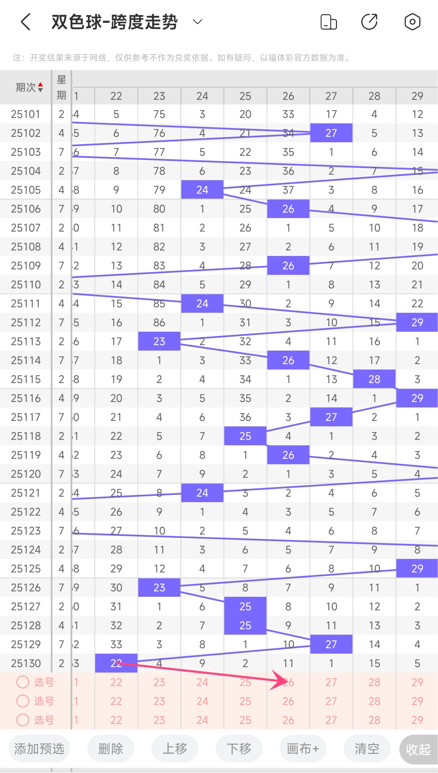 上期龙头为1,凤尾为23,跨度为22,往前一期跨度是27,偏移量为522跨度值是30期内开出的比较小的跨度值。上升的空间比较大,本期看好大跨度值,所以推测本期跨度趋势是往右,跨度变大,小概率往左,跨度值变小。