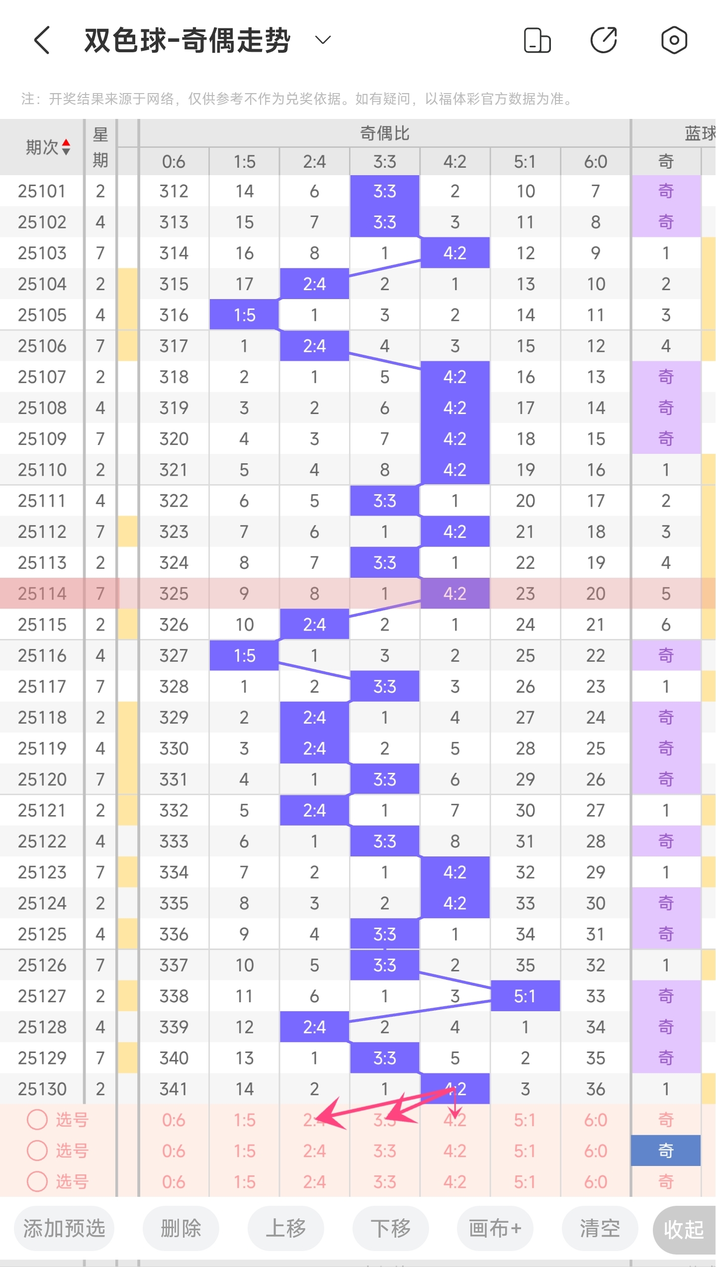 上期奇偶比为4:2,分别为奇奇偶偶奇奇。往前一期奇偶比为3:3。通过近30期内奇偶走势的数据分析,目前1:5奇偶比开出的概率是6.66%5:1奇偶比开出的概率是0%3:3奇偶比开出的概率是33.33%4:2奇偶比开出的概率是33.33%2:4奇偶比开出的概率是23.33%6:0奇偶比开出的概率是0%。与前一期相比,3:3奇偶比变小,4:2奇偶比概率变大。通过分析走势图,目前较大概率开出的是3:32:44:2等奇偶比,本期看好3:3或者2:4奇偶比,其次是继续开4:2奇偶比。所以本期推测本期可能开3:3奇偶比或者2:4奇偶比,其次是开4:2奇偶比,最后是1:55:1奇偶比。