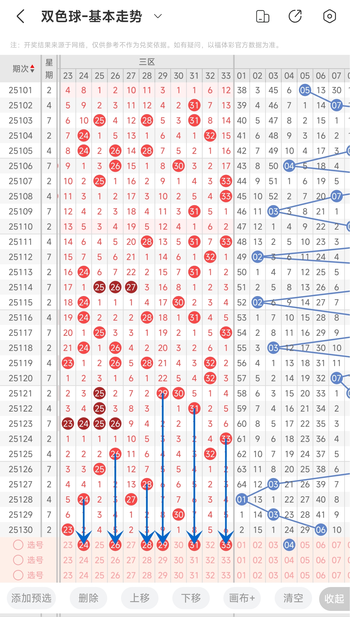 上一期三区开出了23号球。往前一期出了30号球。通过走势图分析,可以看到凤尾趋势变化无常,时而左边,时而右边,时而又中间。所以本期三区我们左中右的号码都要关注一下,本期均匀关注号码。最后再结合冷热号和遗漏期数,本期我们可以关注242628293133等号。综上所述本期我们推测有可能开出242628293133等号码。
