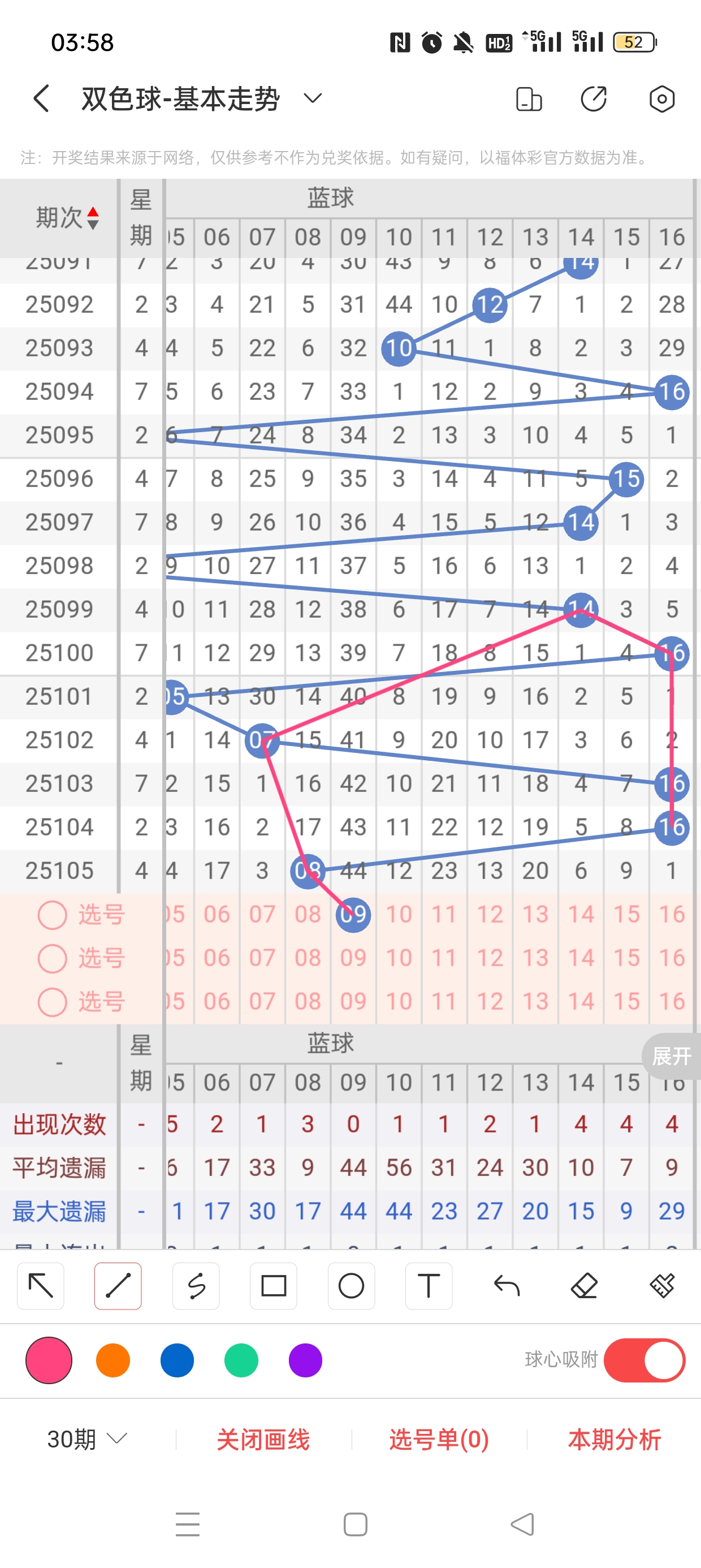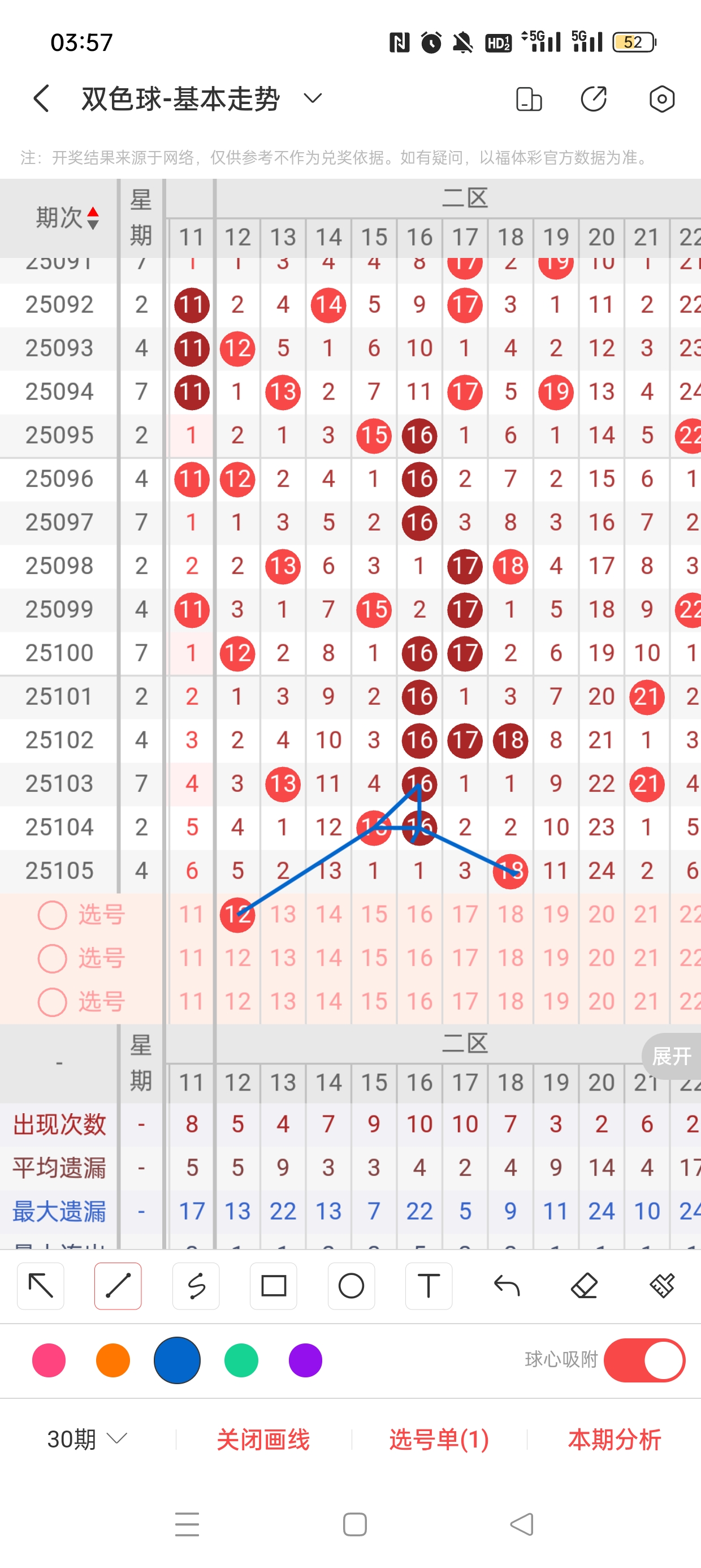 后区(1-16)近103期本区012路23:34:48,1/2路热度高,本期着重0路。9已遗漏44期,与8之间呈现向右遗漏递减态势,需防。