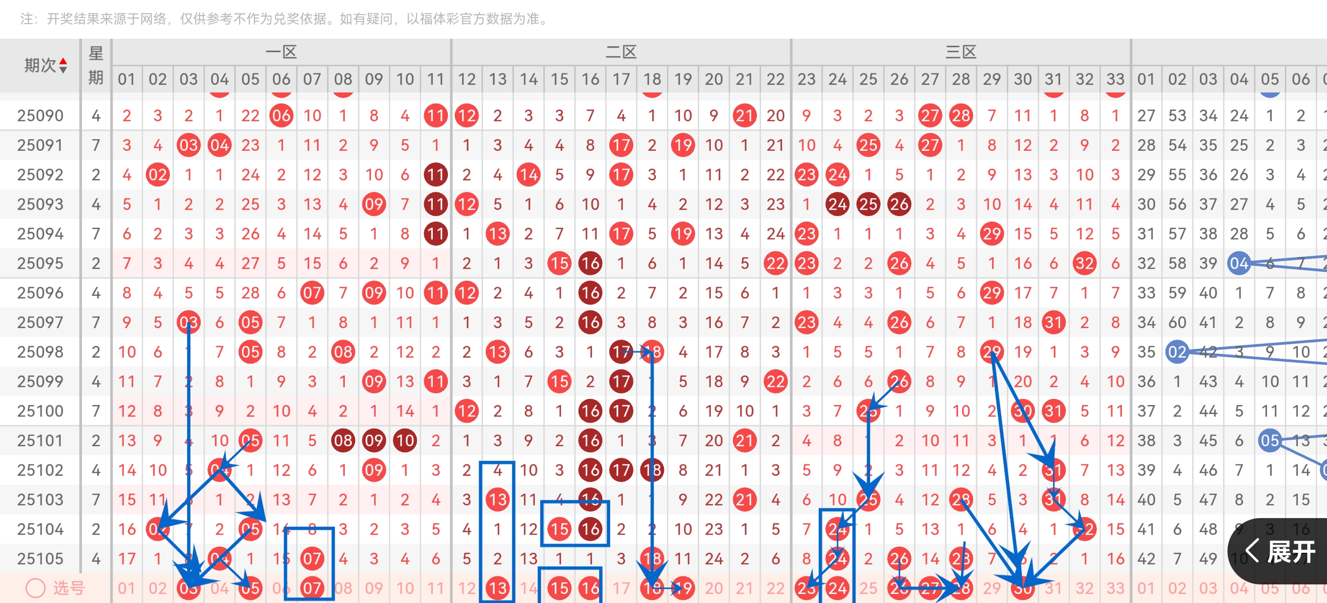 二区(12-22):2码(13 15 16 18 19 22)三区(23-33):2码(24 26 28 30)