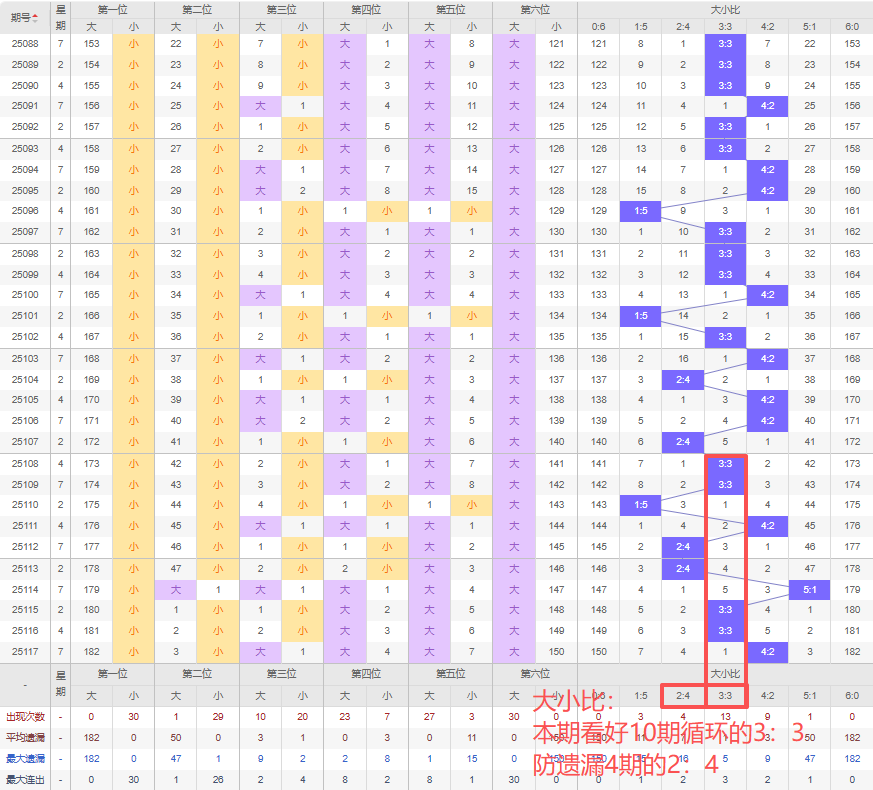 上期大小比:4:2,近10期大小比出现情况:3:3、3:3、1:5、4:2、2:4、2:4、5:1、3:3、3:3、4:2,最近10期出现4期3:3,出现2期4:2,出2期2:4,出现1期5:1,出现1期1:5,出现0期6:0,出现0期0:6,根据近10期规律本期看好10期循环的3:3,防遗漏4期的2:4,综上所述推荐大小比推荐:2:4,重点关注:3:3。