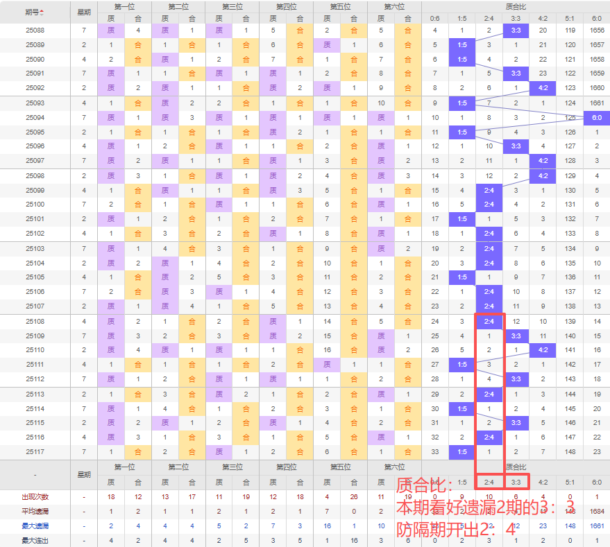 上期质合比:1:5,近10期质合比出现情况:2:4、3:3、4:2、1:5、3:3、2:4、1:5、3:3、2:4、1:5,最近10期出3期3:3,出现1期4:2,出现3期2:4,出现0期5:1,出现3期1:5,出现0期6:0,出现0期0:6,根据近10期规律本期看好遗漏2期出3:3,防隔期开出2:4,综上所述推荐质合比推荐:2:4,重点关注:3:3。