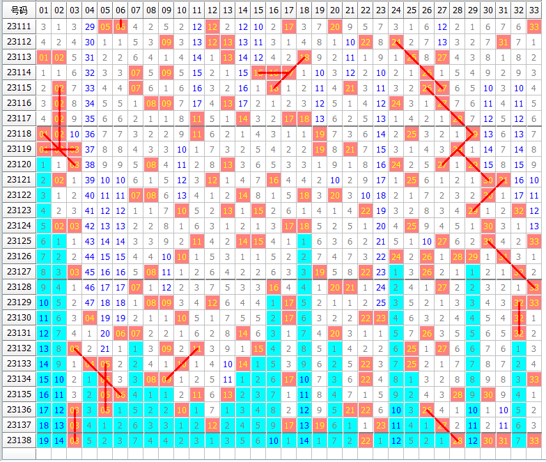 遗漏0-1 期的热码(重码加隔期码)上期开2枚,本期有03 12 17 19 22 23 27 28 30 31 33共11枚,重码上期开出1枚,近期趋向活跃,本期应该有开出,预测本期重码开1-2枚。隔码上期开出2枚,按近期跟随表现,本期难言必开,预测本期隔码开0-1枚。综合起来,本期热码(重码加隔码)应该有开出,预测本期热码开1-2枚。胆码可在这里选择。
