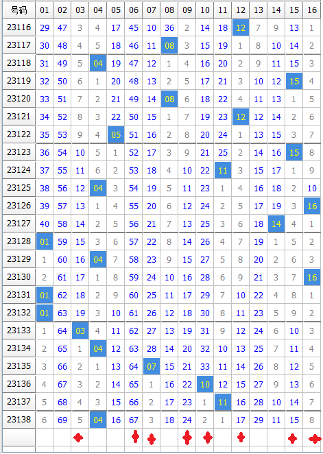 (数字为遗漏期数,蓝色标记的为遗漏超过10期的大冷号)