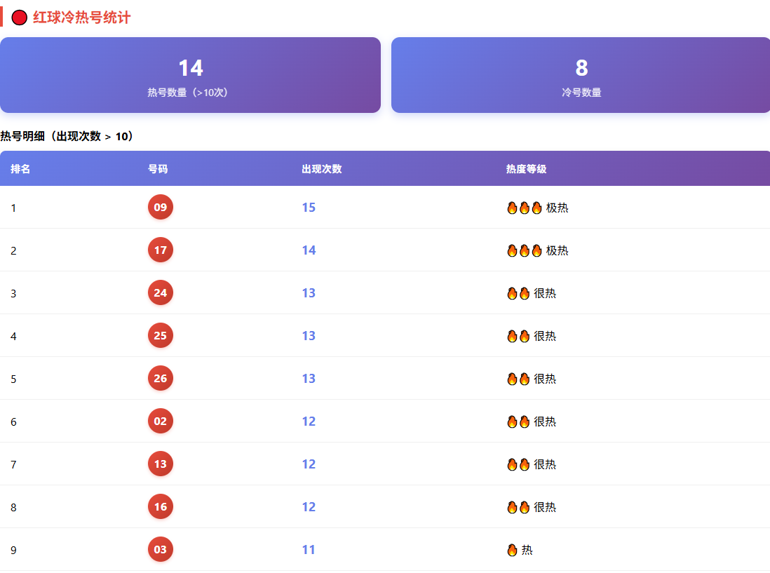 将目光拉长到近 50 期观察,我们看到红球热号 TOP5:09(15次)、17(14次)、24(13次)、25(13次)、26(13次)。这几个号码似乎总在舞台边缘张望,一有机会就跃上台前。冷号如 07(5次,距上次出现已6期)、22(4次,距上次已27期)则像是潜伏者,虽少露面,但潜力不容忽视。蓝球方面,10 次数 6次,相对活跃;而 04、05、14、15、16 等长时间未露,暂时可作为旁观。