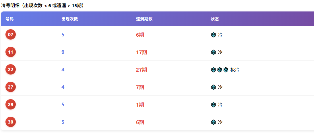 这些号码或长期遗漏,或刚刚回补,阶段性“静默”状态较明显。