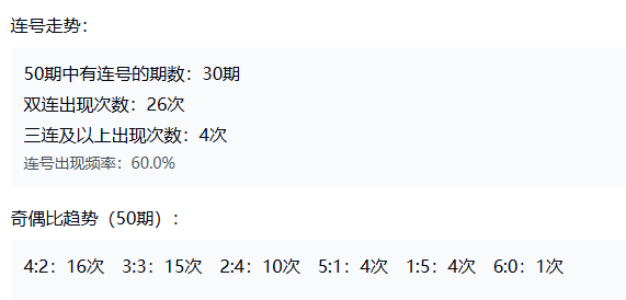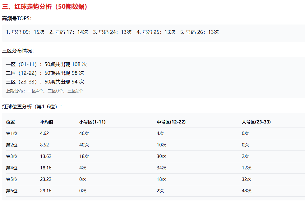 从红球“位置”观察,第1、2位主要落在小号区(1-11),第3、4位偏中号(12-22),第5、6位则几乎由大号(23-33)占据。这趋势告诉我们,号码布局若能兼顾三区、兼顾不同位置,反而更符合近期格局。在三区分布上,一区、二区、三区近 50 期的出号分别约为 108、98、94 次,上期正好是一区4个、二区0个、三区2个,体现出一区稍强、二区休整、三区保持。连号走向也值得关注:50期中连号出现30次、双连26次、三连4次。上期的双连 1-2 已现,那么下期若继续留意邻近号块将更有幅度。