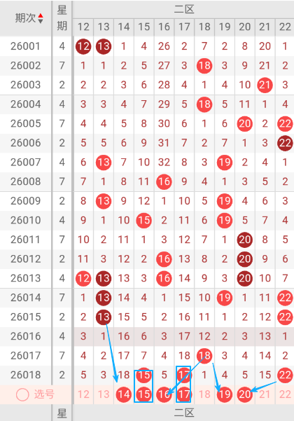 根据走势图可以看出当前区段,008期开出16一个号码球 ,009期开出13.19二个号码球 ,010期开出15.19二个号码球 ,011期开出20一个号码球 ,012期开出16.20二个号码球 ,013期开出12.13.16.20四个号码球 ,014期开出13.19.22三个号码球 ,015期开出13.22二个号码球 ,016期没有开出号码球 ,017期开出18一个号码球 ,018期开出15.17.22三个号码球 ,按照如此规律本期当前区可能开出2单或1单。我们看下当前区上期没有开出重叠号,那么本期当前区要定重叠号的情况下可关注15号码球。再看下当前区上期开出17斜连号,当期选号得留意斜连19号码球。本区重点关注14.15.16.17.19.20