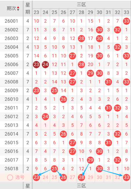 根据走势图可以看出当前区,009期开出23.25二个号码球 ,010期开出26一个号码球 ,011期开出31.32二个号码球 ,012期开出24一个号码球 ,013期没有开出个号码球 ,014期开出26.32二个号码球 ,015期开出27.31二个号码球 ,016期开出27.30二个号码球 ,017期开出29.32二个号码球 ,018期开出25.30二个号码球 ,按照如此规律判断本期当前区可能开出1双1单。我们看下当前区上期没有开出重叠号,那么本期当前区要定重叠号的情况下可关注30码球。再看下当前区上期开出30斜连号,当期选号得留意26斜连号。本区重点关注23.26.28.33