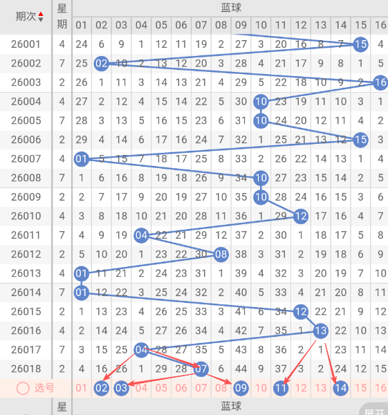 根据走势图近10期的走势看,蓝球在14期开出01蓝球之后,2大2小,再看下近10期的蓝球中冷码有回补的趋势,这种趋势规律本期判断极有可能开单号,本期防蓝球10双号,蓝球本期重点关注02,05,06,12,14