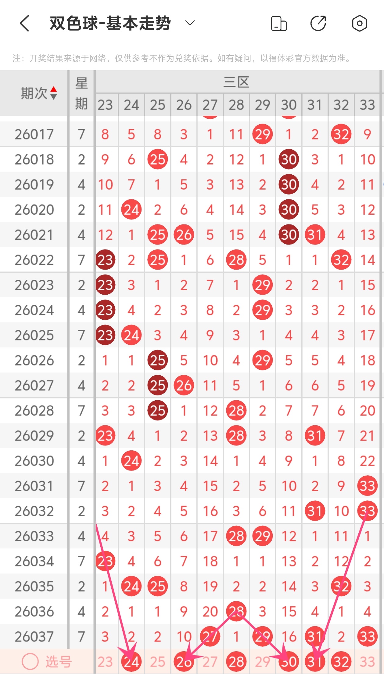 上期第三区间开出27 29 31 33,本期我们可以从上面走势图中看到选号的思路,24为斜连走势,26为斜连走势,30为斜连走势,31为斜连走势,综合以上分析本期第三区间推荐24 26 28 30 31 32