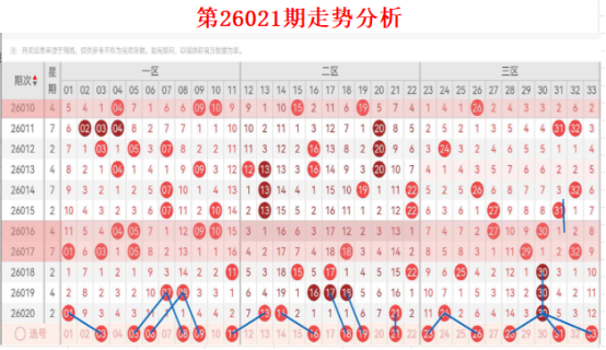 · 连号:020期开出13-14一组连号。根据“连号后回调”规律,本期仍可防范1组两连号。重点区域:一区中段(05-07)、三区前端(26-28) 。