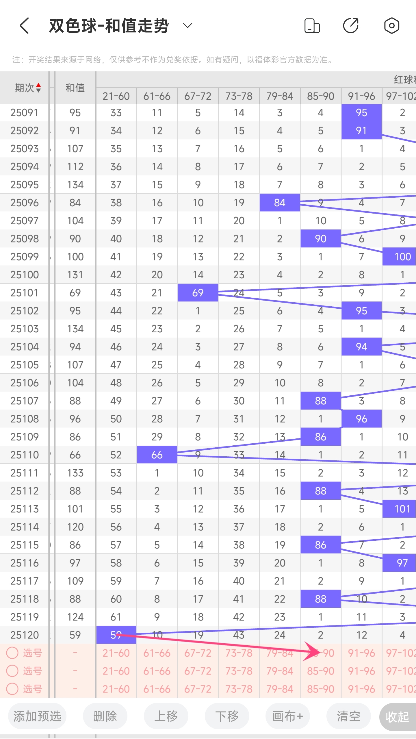 上期和值为59,而近5期和值为97,109,88,124,59均值95.4,上期和值较前一期减少了65,振幅为65。59和值是属于近30期内开出的最小和值,下降的空间已经非常小,上升的空间很大。所以推测本期和值趋势是大概率往右上升,和值变大,极小概率继续往左,和值变小。