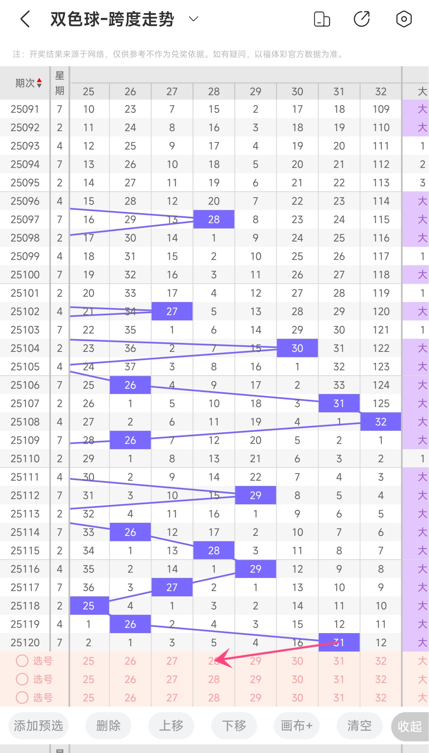 上期龙头为1,凤尾为32,跨度为31,往前一期跨度是26,偏移量为5。31跨度值是30期内开出的第二大的跨度值。近期龙头和凤尾都要可能开最左边和最右边,因此跨度有可能上升到最大值,但更大可能是跨度变小。因此推测本期跨度有大概率趋势是往左的,跨度小幅度变小,小概率继续往右,跨度小幅度变大。