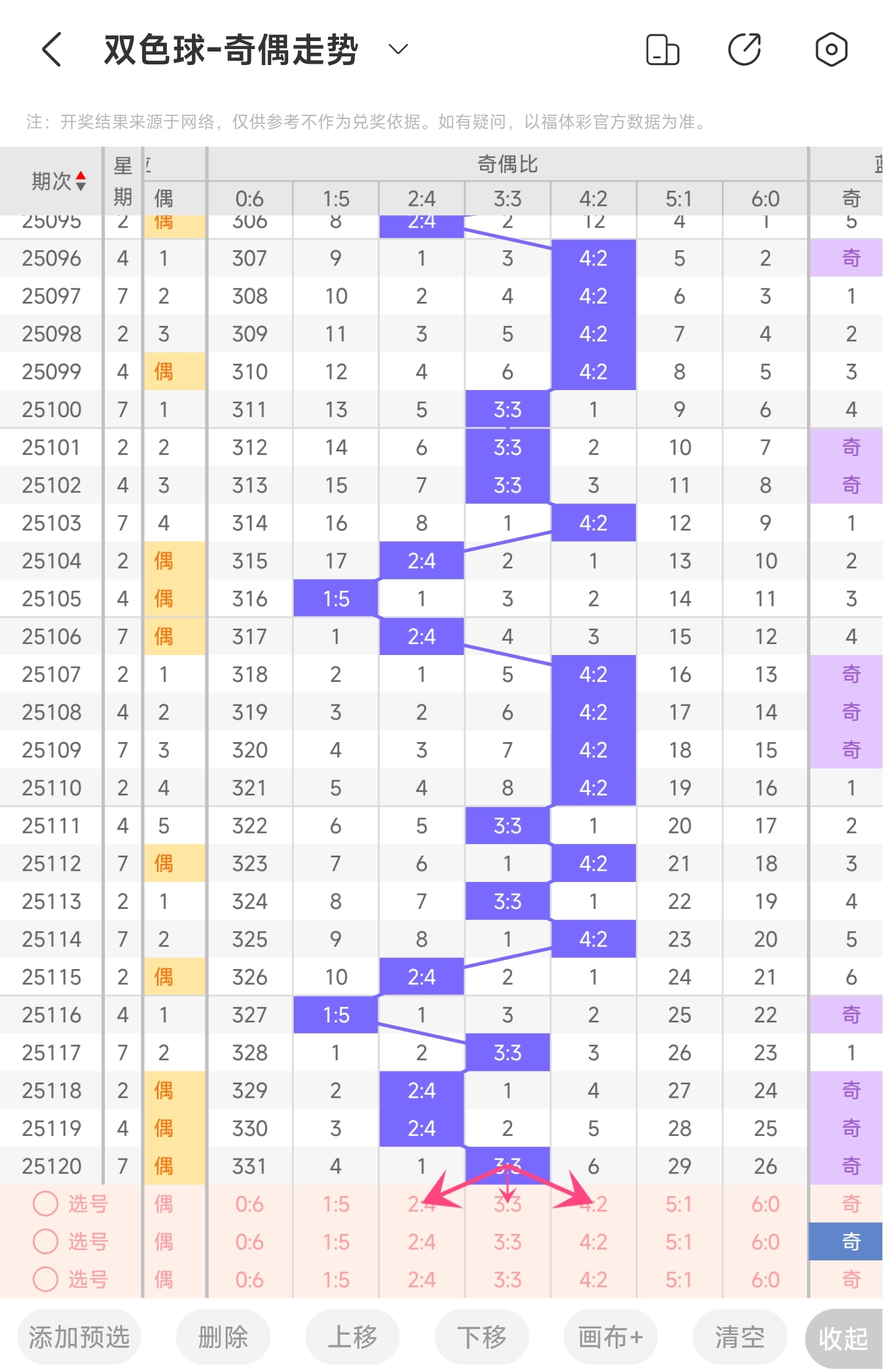 上期奇偶比为3:3,分别为奇偶偶奇奇偶。往前一期奇偶比为2:4。通过近30期内奇偶走势的数据分析,目前1:5奇偶比开出的概率是6.66%,5:1奇偶比开出的概率是3.33%,3:3奇偶比开出的概率是30%,4:2奇偶比开出的概率是36.66%,2:4奇偶比开出的概率是20%,6:0奇偶比开出的概率是3.33%。与前一期相比,概率没有发生变化。通过分析走势图,可以看到2:4和3:3奇偶比回补的概率比较大,所以推测本期有可能继续开出3:3奇偶比或者2:4奇偶比,其次是4:2奇偶比,最后是1:5和5:1奇偶比。